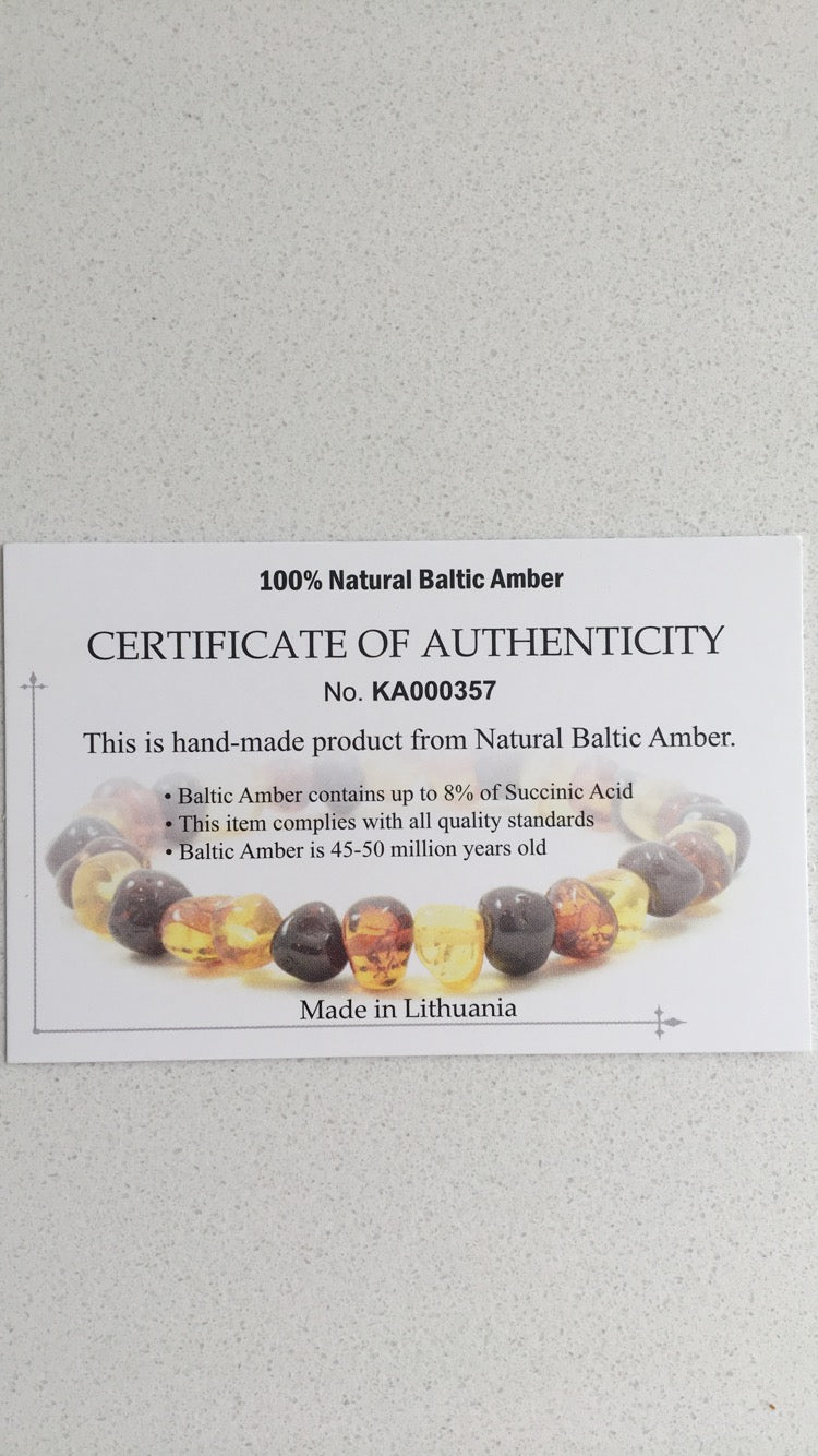 NOT SUITABLE FOR UNDER 36 MONTHS. EU Toy safety regulations EN-71-1. Amber is NOT a toy. Do not leave your child unattended, do not allow them to chew on the amber. Keep out of reach when not in use
