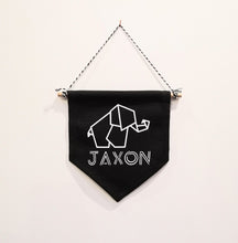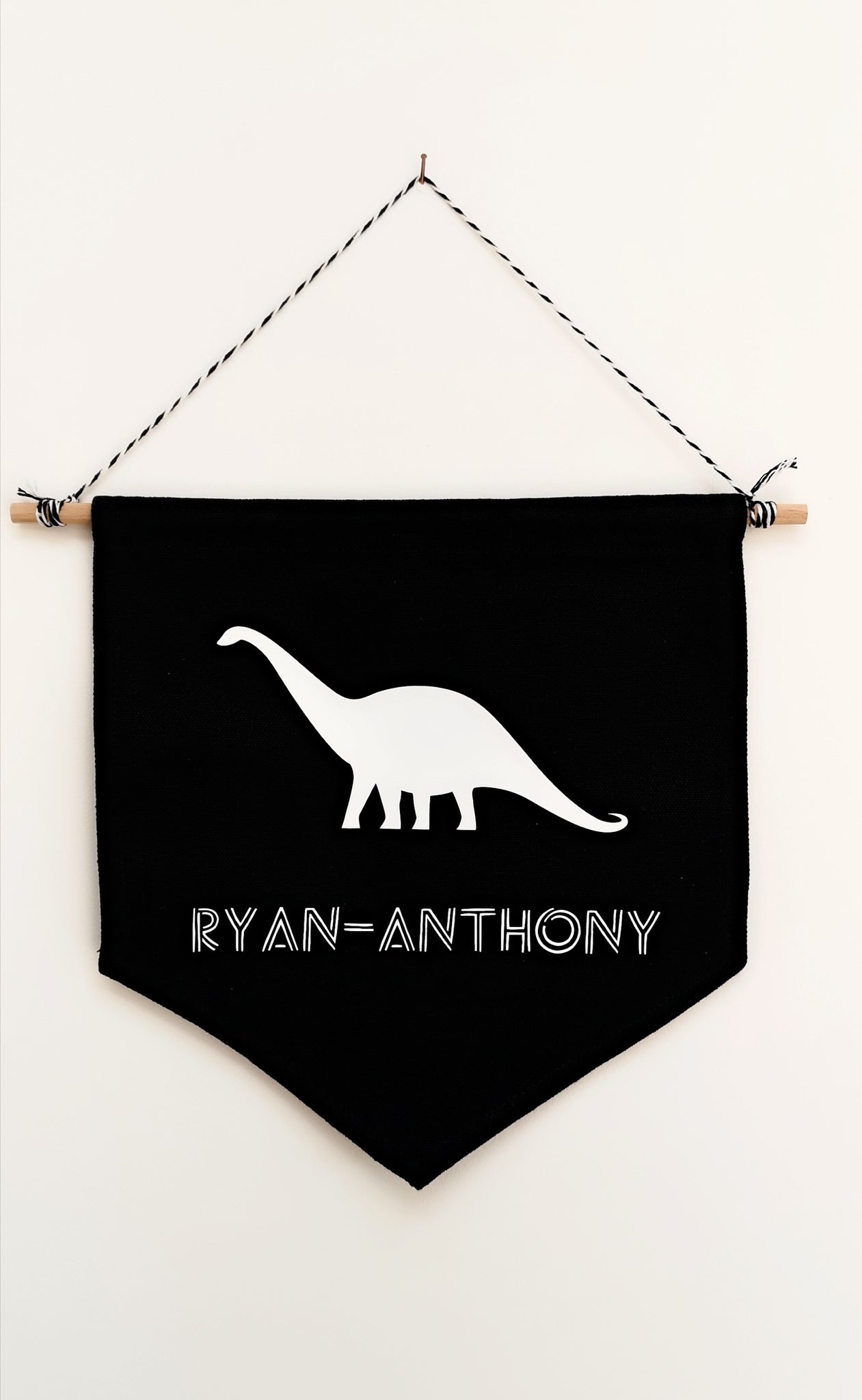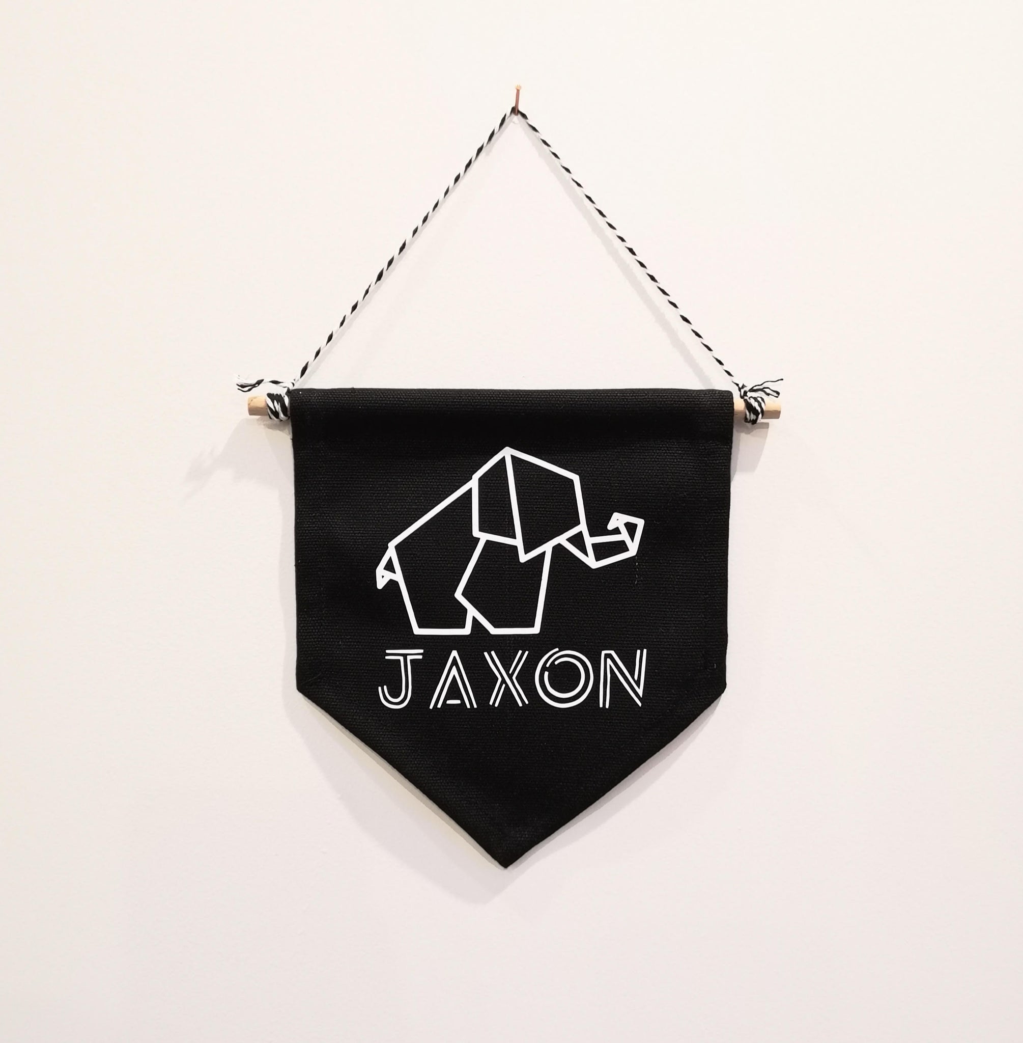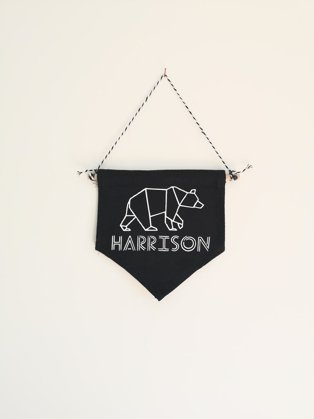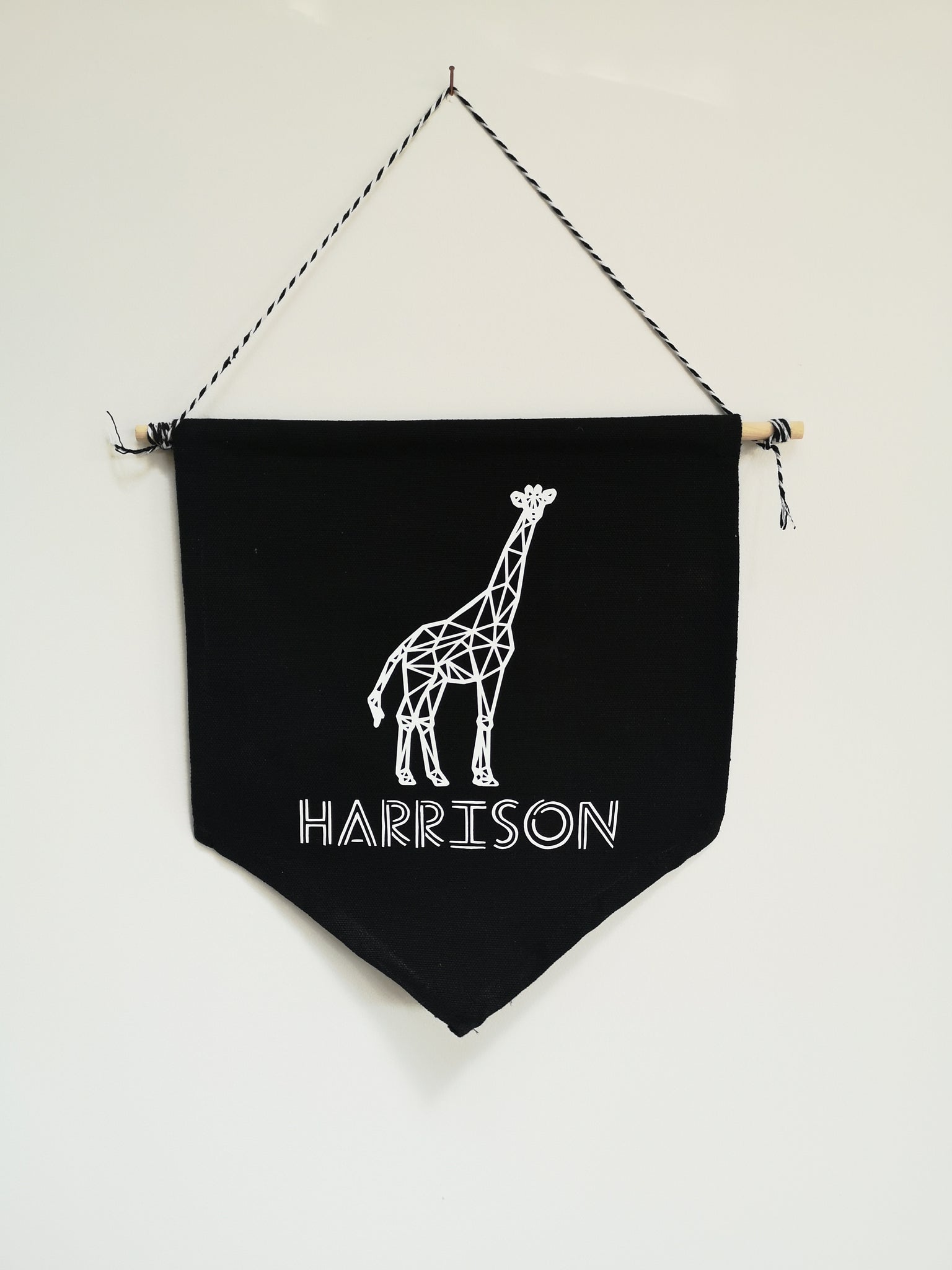 A Black cotton pennant personalised to sit proudly on your Childs bedroom/playroom wall or door. Hung on a wooden dowel and a twisted cotton string to hang.