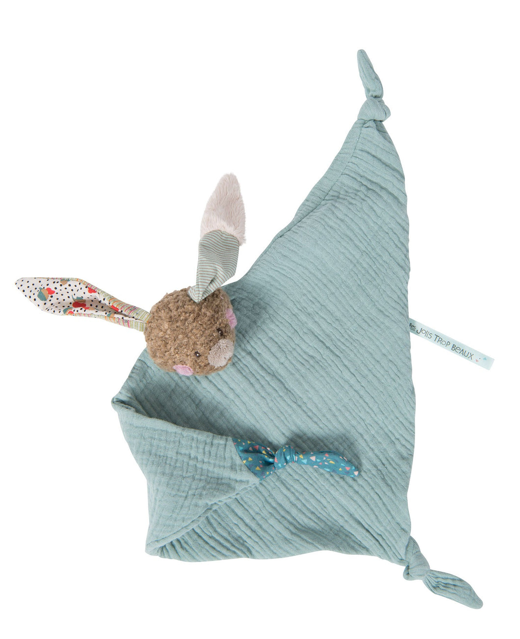 Here are the Jolis Pas Beaux's cousins: the Jolis Trop Beaux! This comforter featuring a cheeky rabbit is made of soft blue muslin. It is easy to grab and nibble thanks to its 3 knots. Lovely present for a newborn, matching muslin square and luxury blanket available.