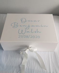 If you would like the gift box personalised, please state in the comments if you would like Blue, Pink or Grey Vinyl and what details you would like on it