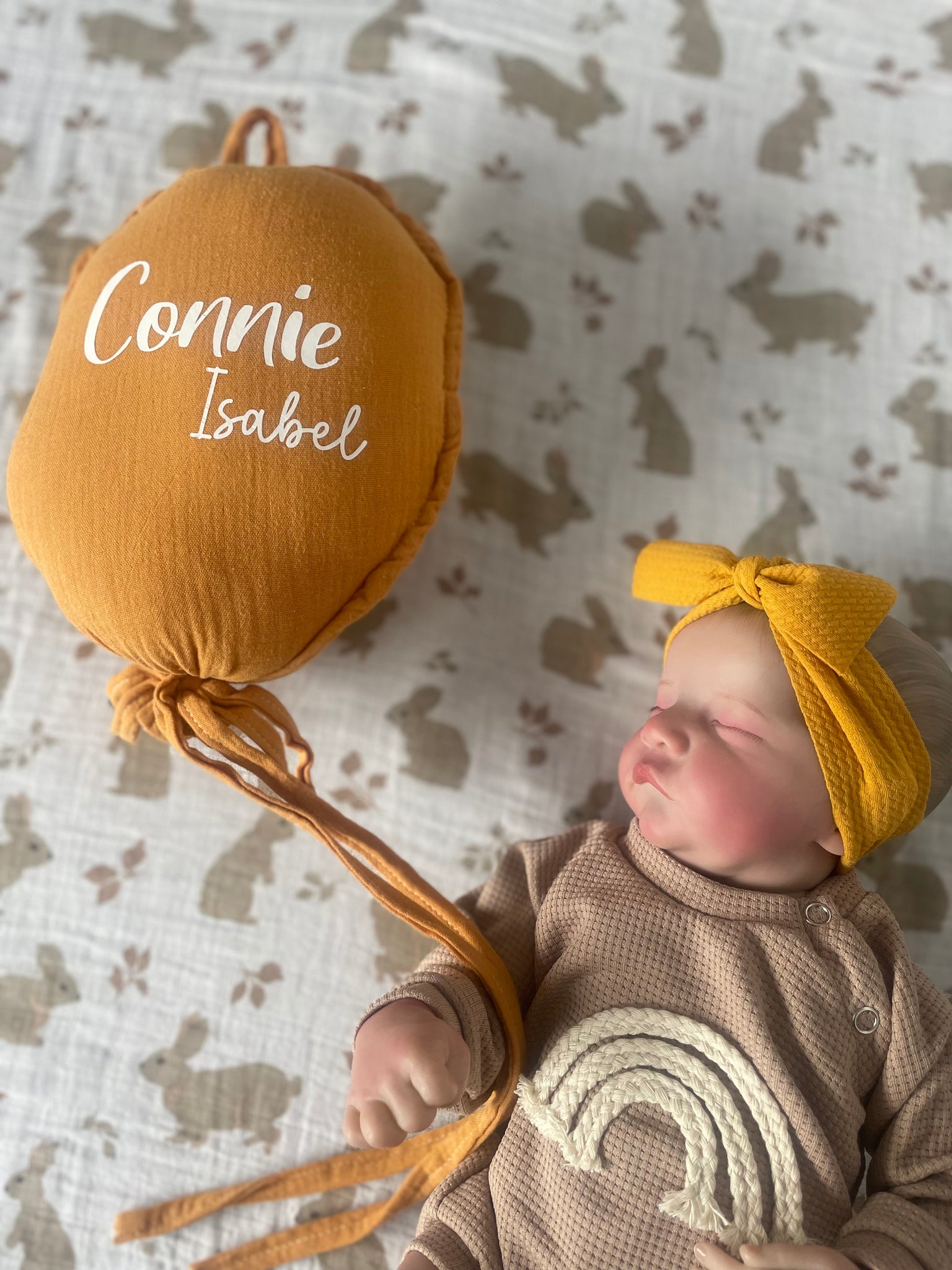 A gorgeous high quality fabric balloon which can be personalised with a name or you can simple order it plain and hang it as a decoration in baby's room or a playroom.