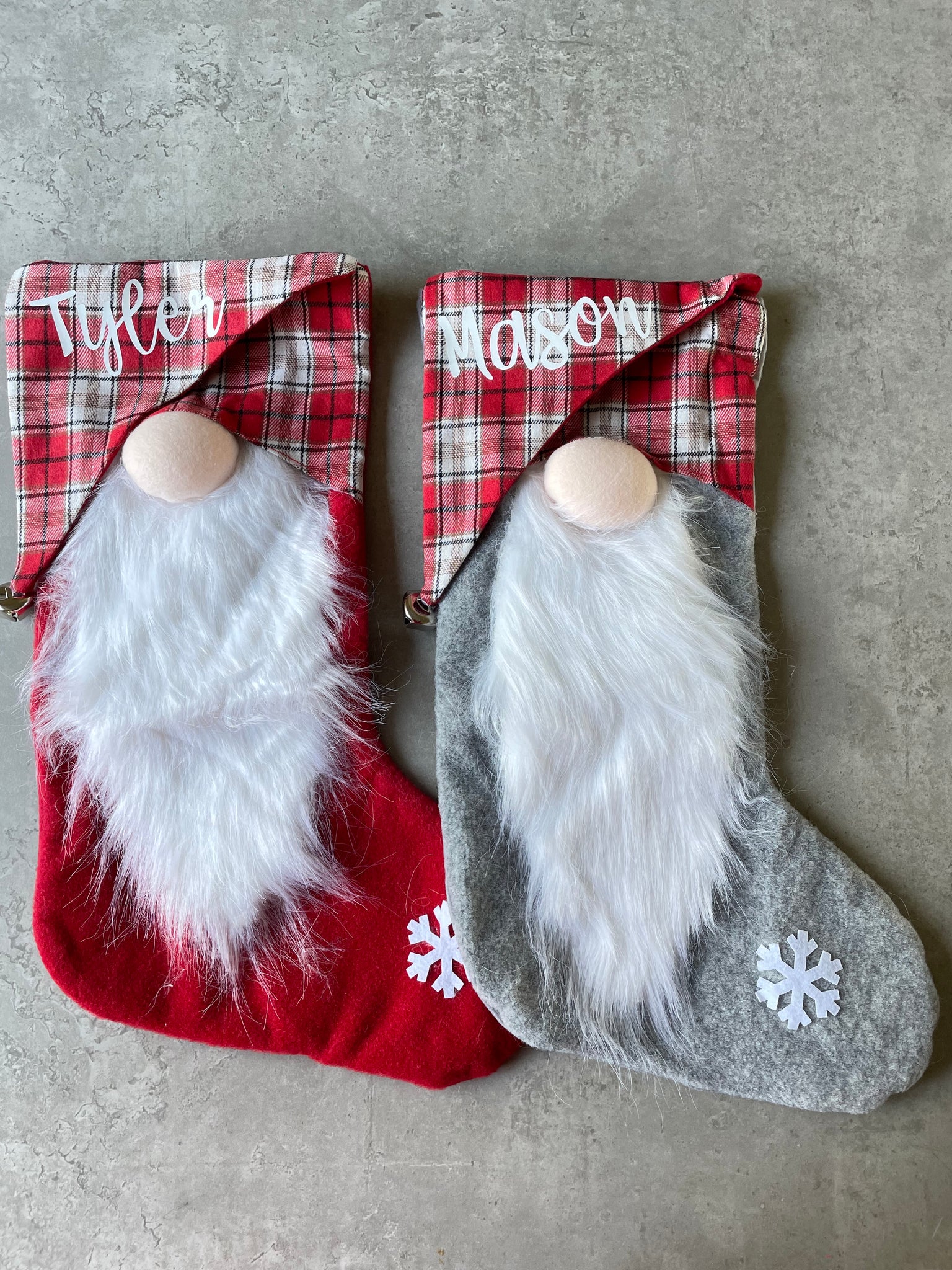 Personalised Gonk Stocking available in Grey or Red with White Sparkly vinyl name on hat